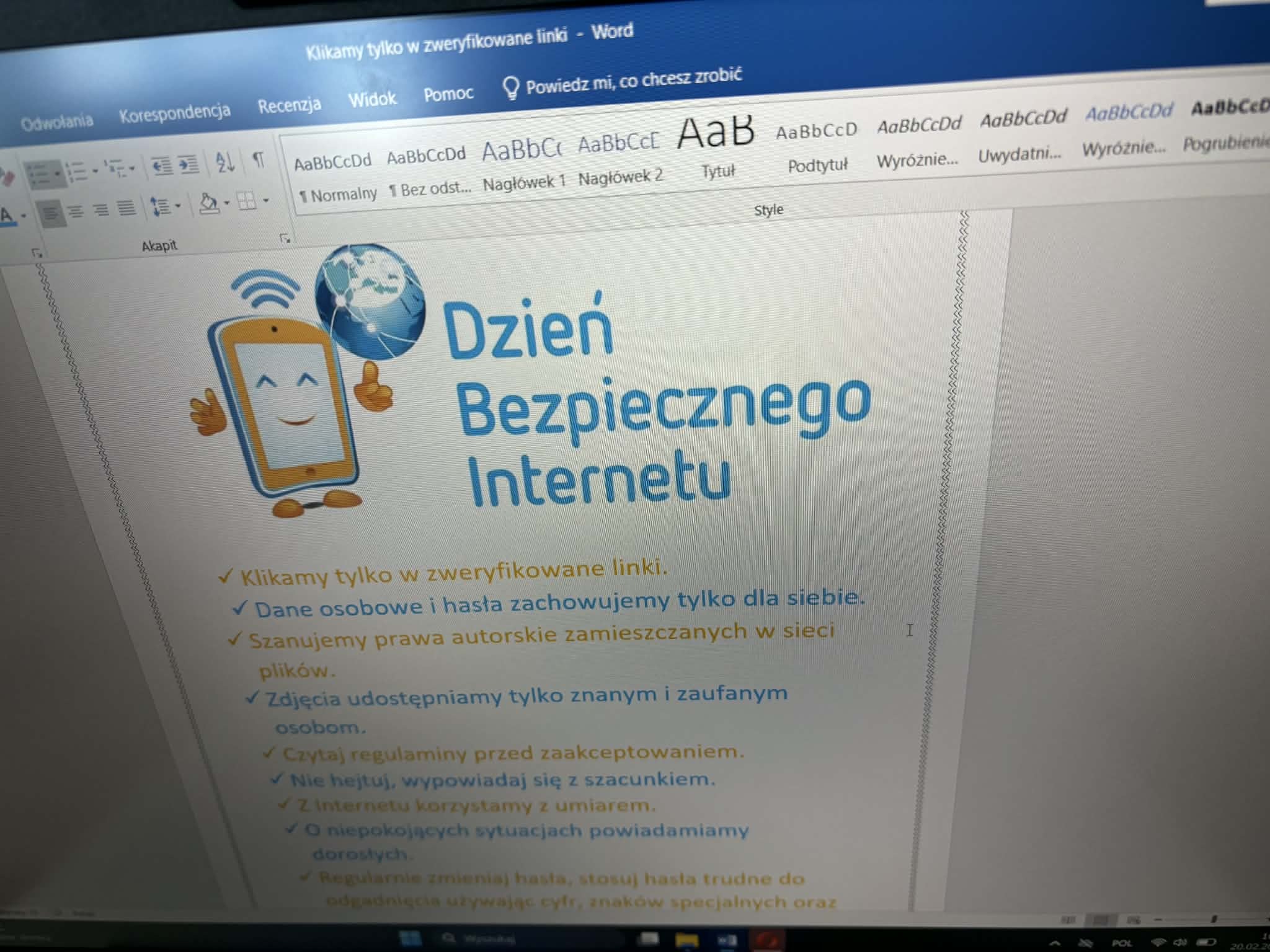 W ramach obchodów uczniowie uczestniczyli w lekcjach higieny cyfrowej, w warsztatach, oraz pogadankach prowadzonych przez nauczycieli. Podczas zajęć poruszono tematy związane z ochroną danych osobowych, cyberprzemocą, hejtem w sieci, a także zasadami tworzenia bezpiecznych haseł. Nie zabrakło również quizów i konkursów sprawdzających wiedzę uczniów na temat bezpieczeństwa w Internecie. Uczniowie przygotowali plakaty promujące kulturalne zachowanie w sieci, natomiast starsze klasy brały udział w dyskusjach na temat odpowiedzialności prawnej za działania podejmowane online. Całość wydarzenia przebiegała w atmosferze zaangażowania i współpracy, a zdobyta wiedza z pewnością przyczyni się do bezpieczniejszego korzystania z Internetu przez społeczność szkolną.