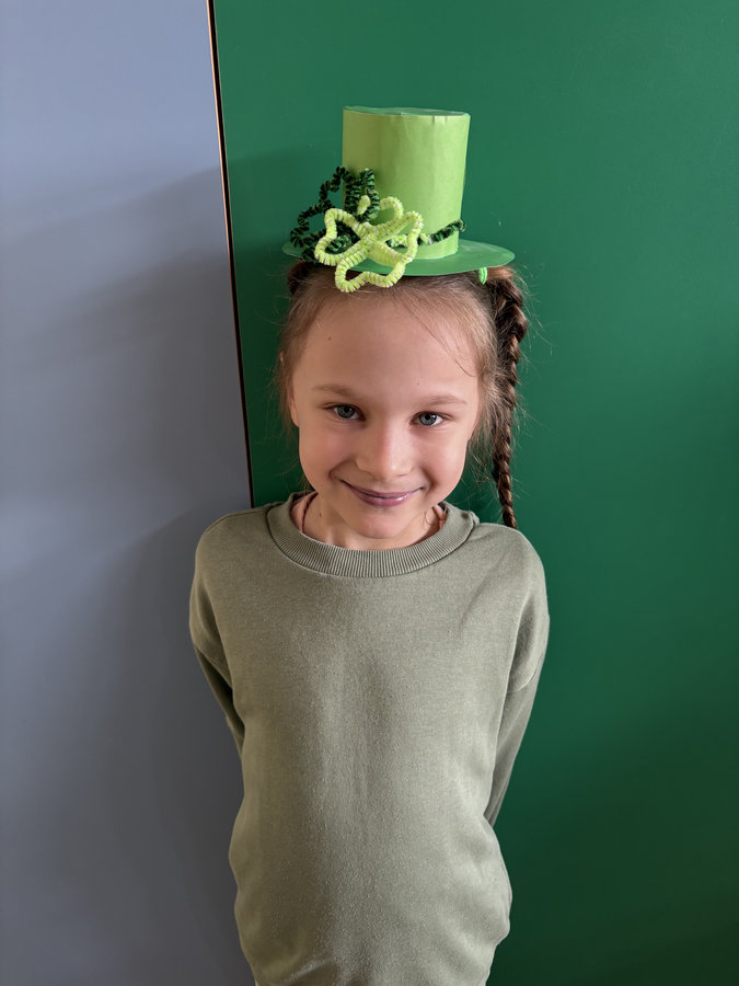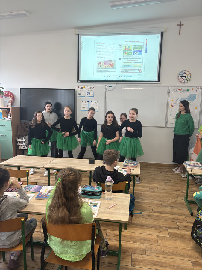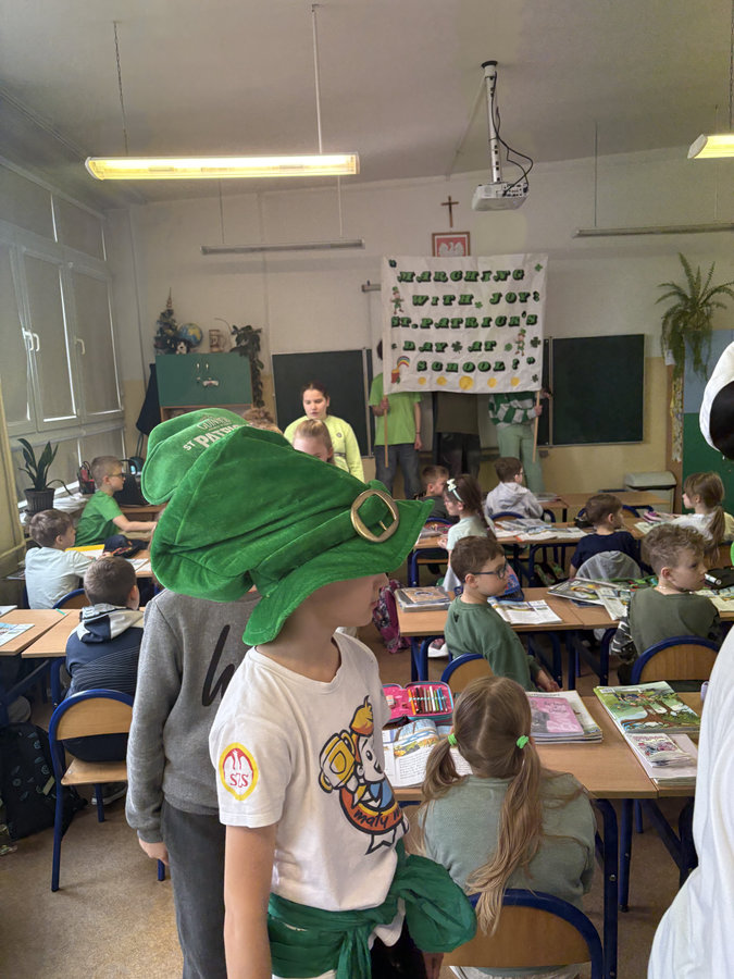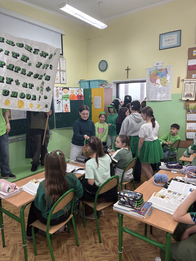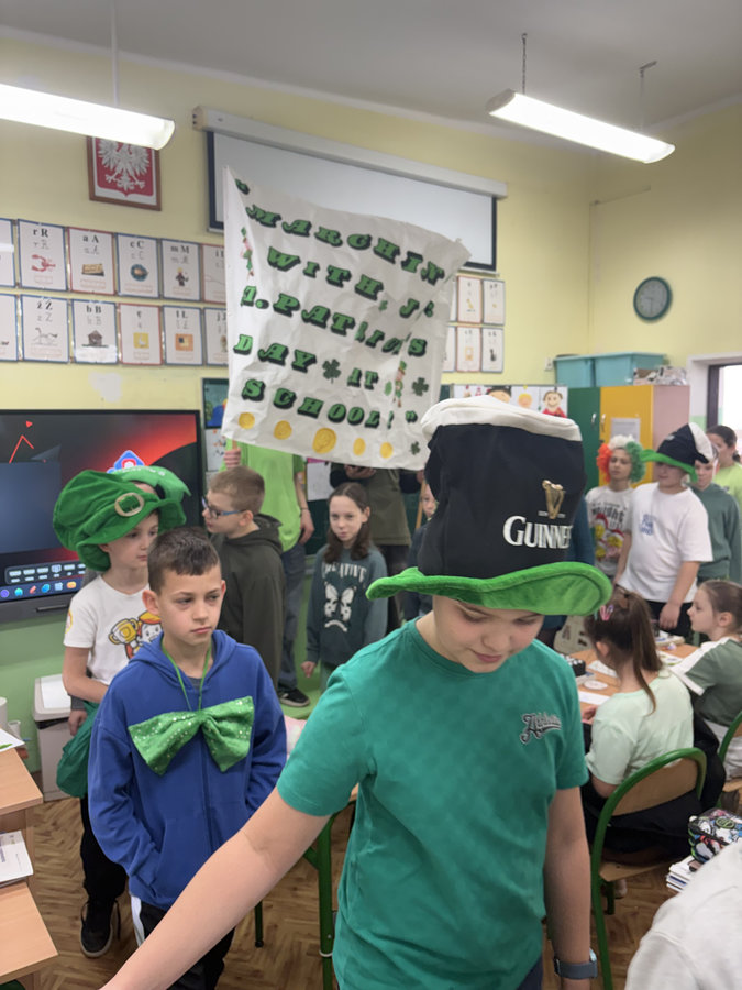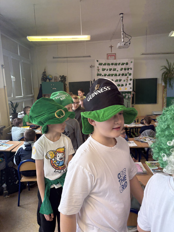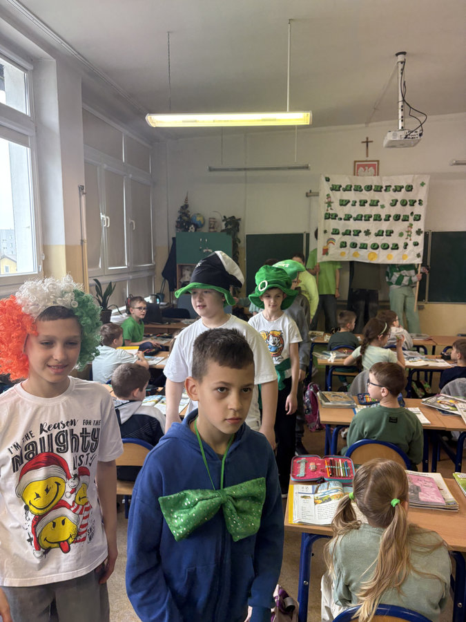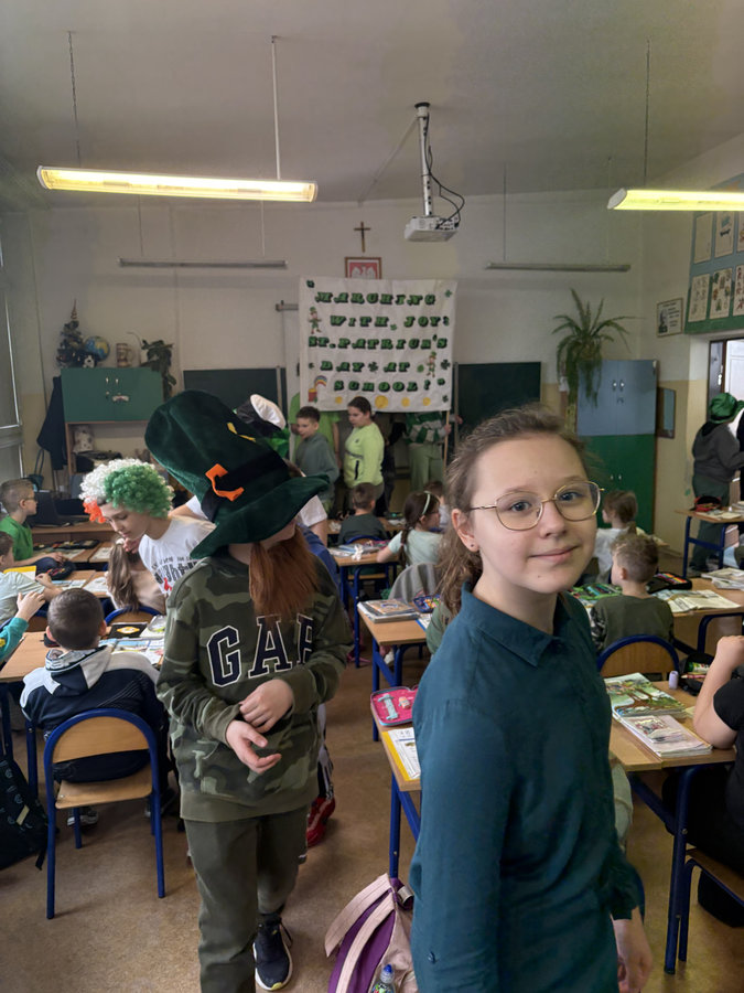 Podczas lekcji języka angielskiego uczniowie poznawali ciekawostki, tradycje i fakty związane z irlandzkim świętowaniem. Był to dzień pełen dobrej energii, wspólnej zabawy i zielonego nastroju — radosny, kolorowy i niemal wiosenny!