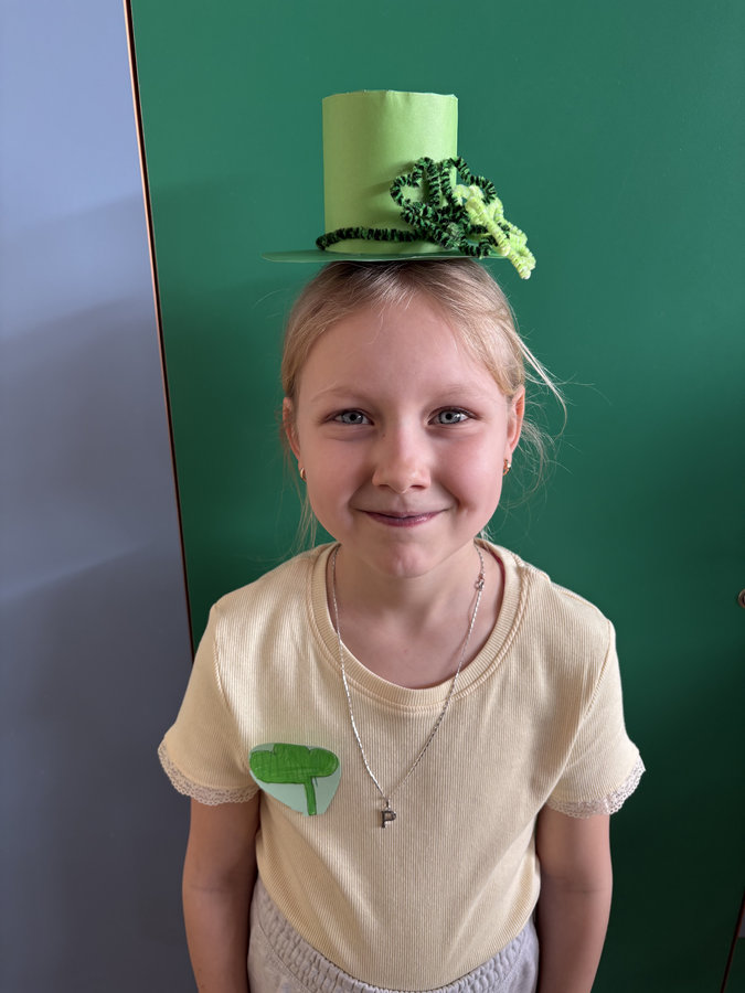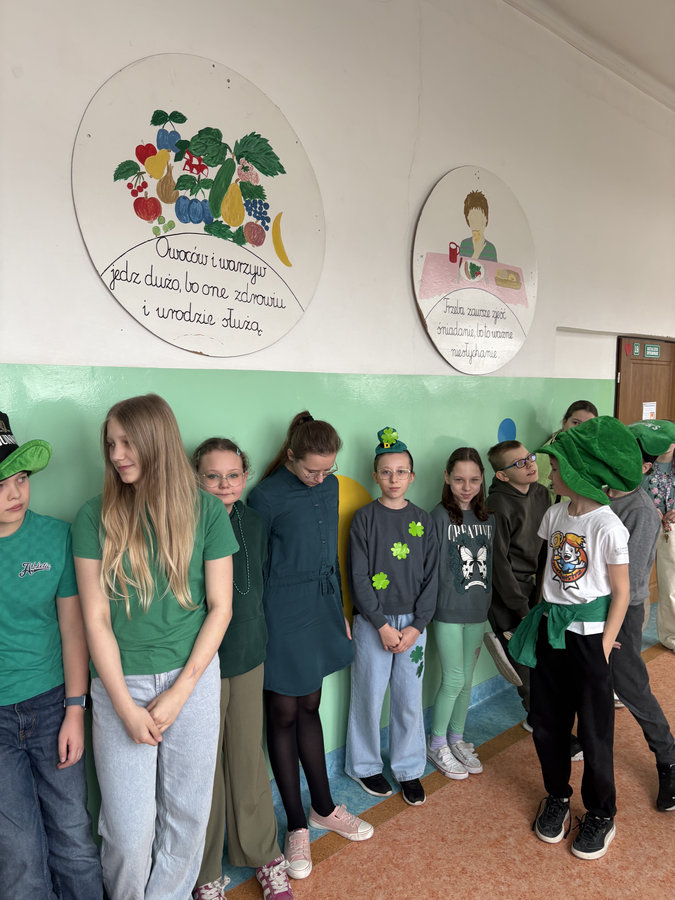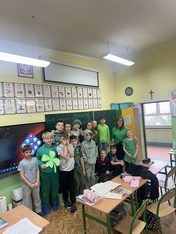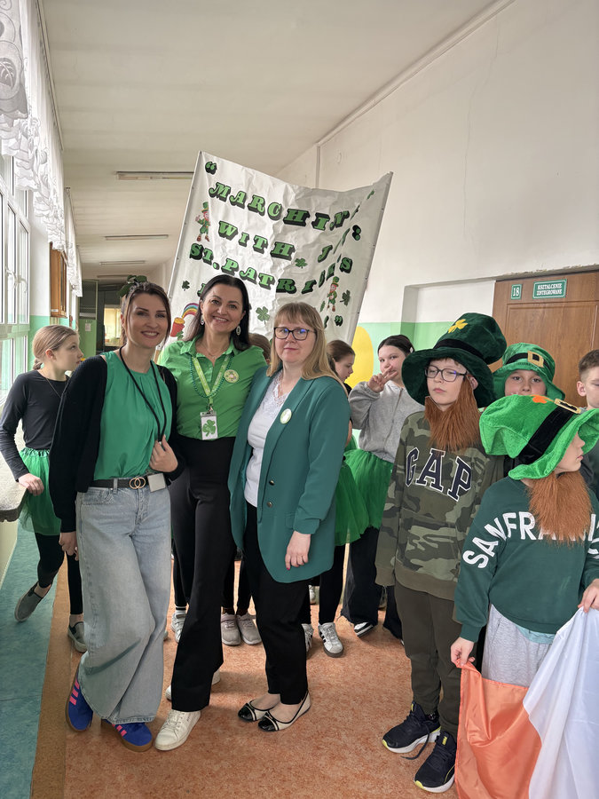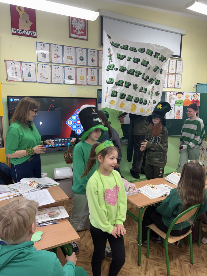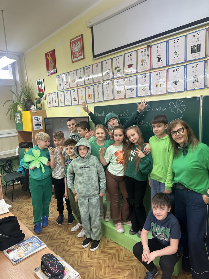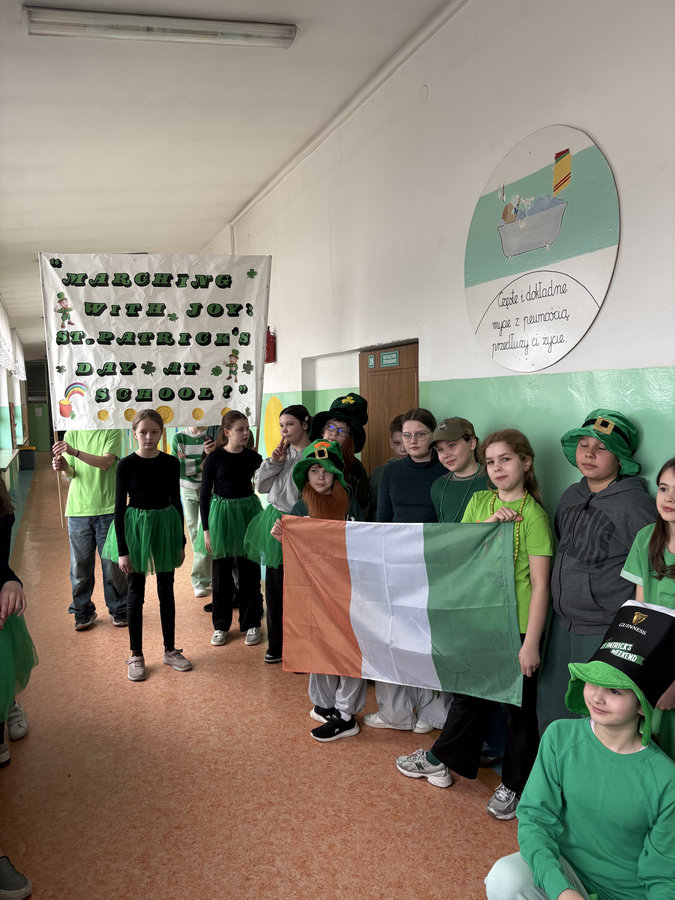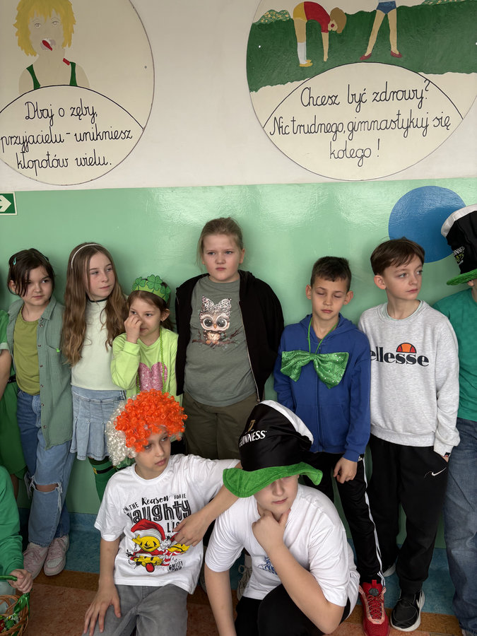 Podczas lekcji języka angielskiego uczniowie poznawali ciekawostki, tradycje i fakty związane z irlandzkim świętowaniem. Był to dzień pełen dobrej energii, wspólnej zabawy i zielonego nastroju — radosny, kolorowy i niemal wiosenny!