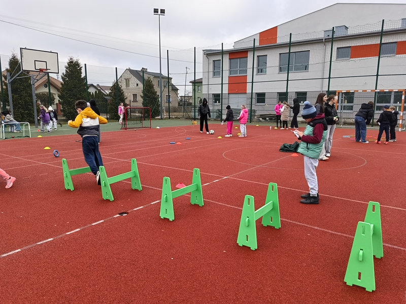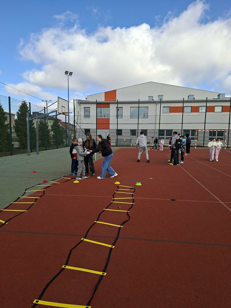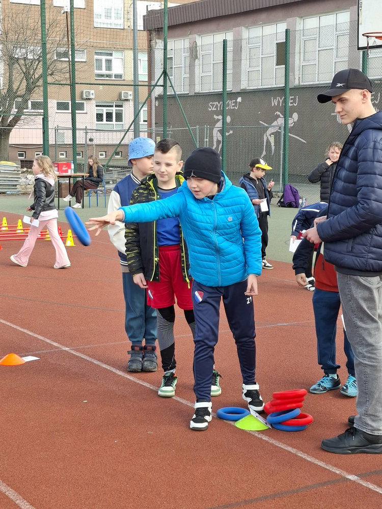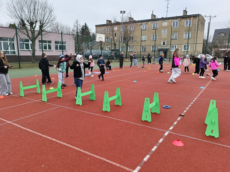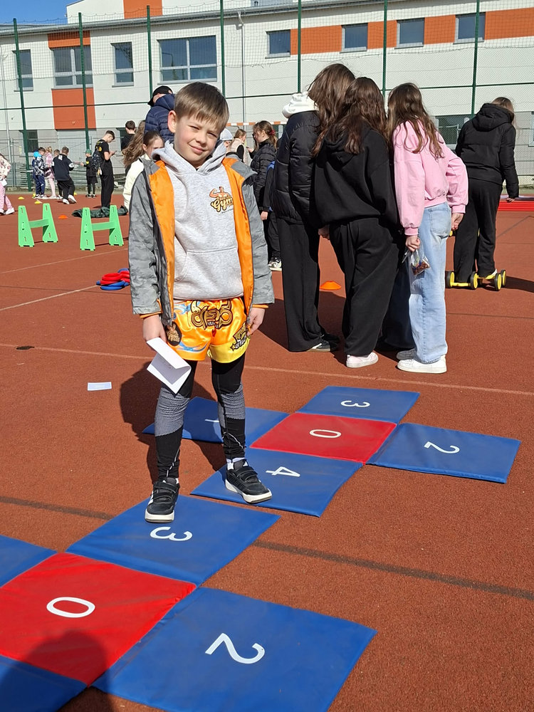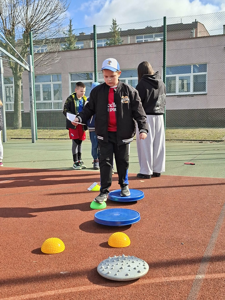 Najmłodsi uczniowie mieli okazję sprawdzić swoje siły w specjalnie przygotowanej OLIMPIADZIE WIOSENNEJ z torem przeszkód. Zadania wymagały sprawności, sprytu i dobrej zabawy – a radość dzieci była najlepszym dowodem na to, że aktywność fizyczna może być prawdziwą przyjemnością.