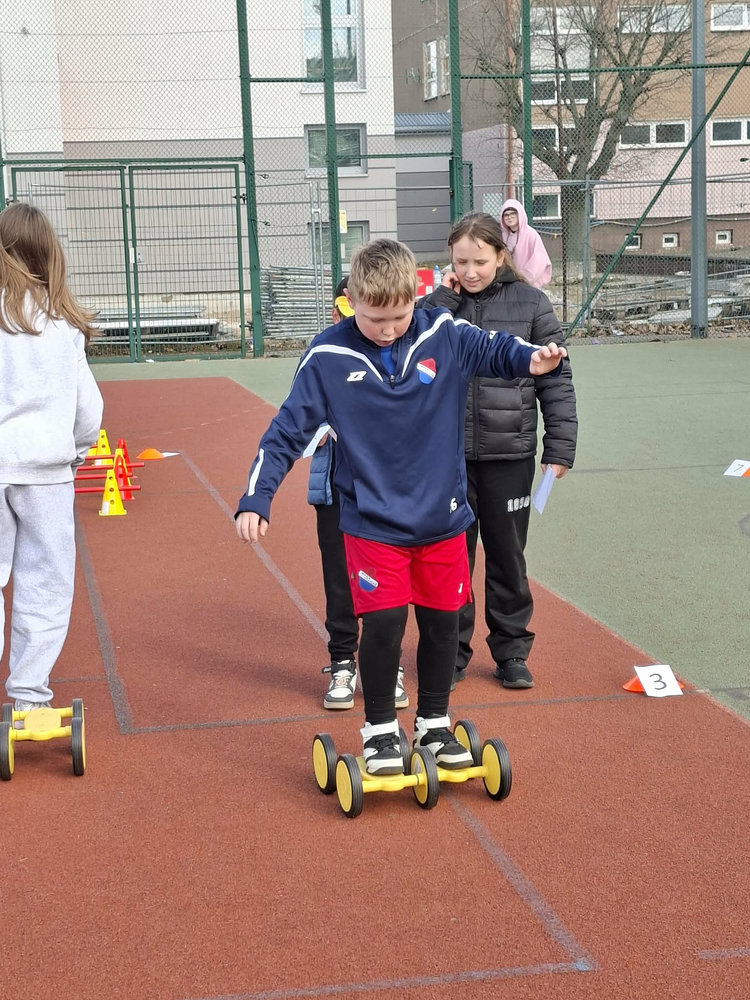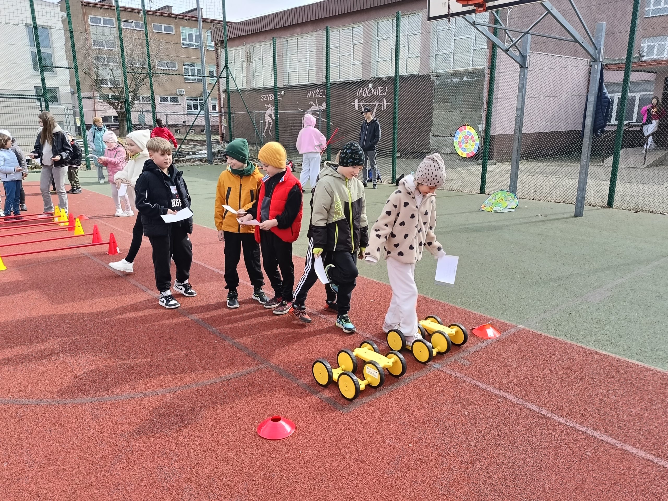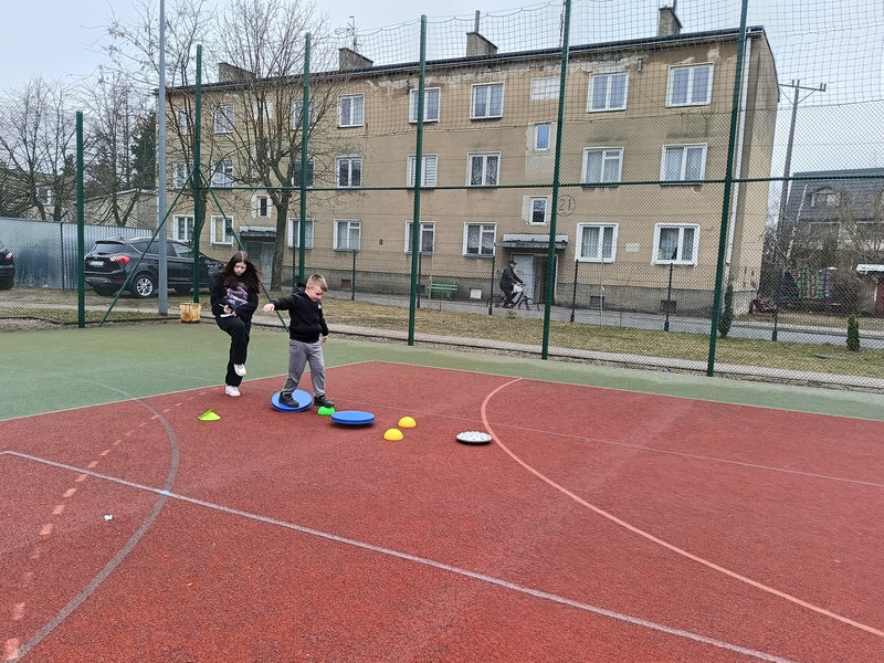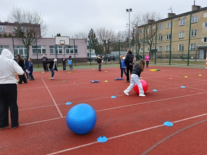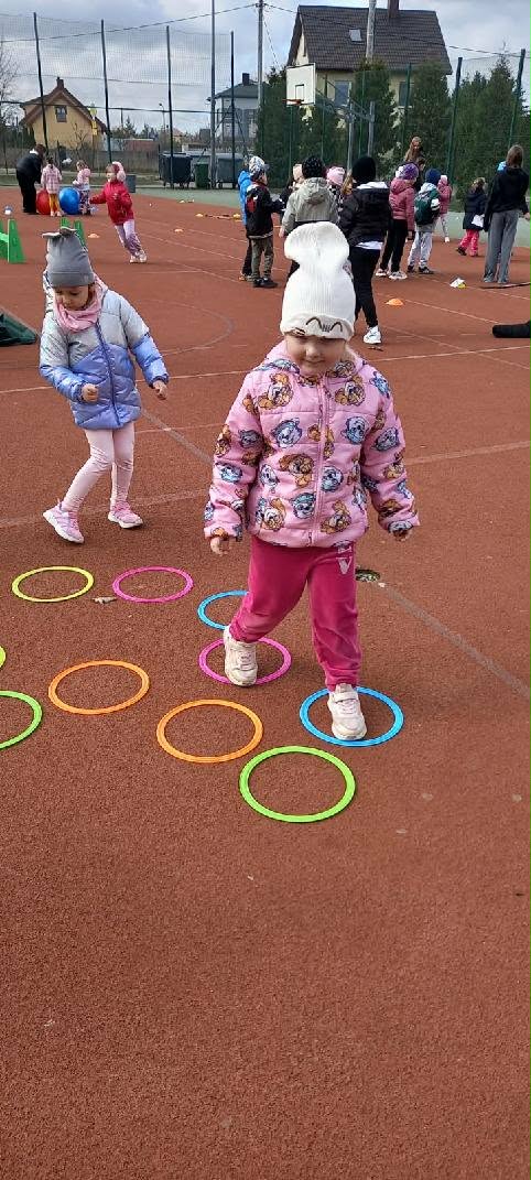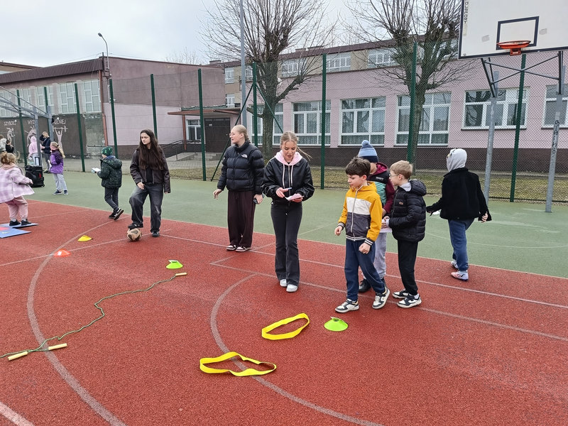 Najmłodsi uczniowie mieli okazję sprawdzić swoje siły w specjalnie przygotowanej OLIMPIADZIE WIOSENNEJ z torem przeszkód. Zadania wymagały sprawności, sprytu i dobrej zabawy – a radość dzieci była najlepszym dowodem na to, że aktywność fizyczna może być prawdziwą przyjemnością.