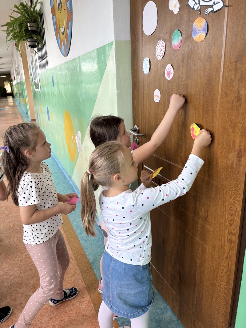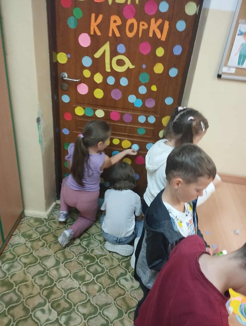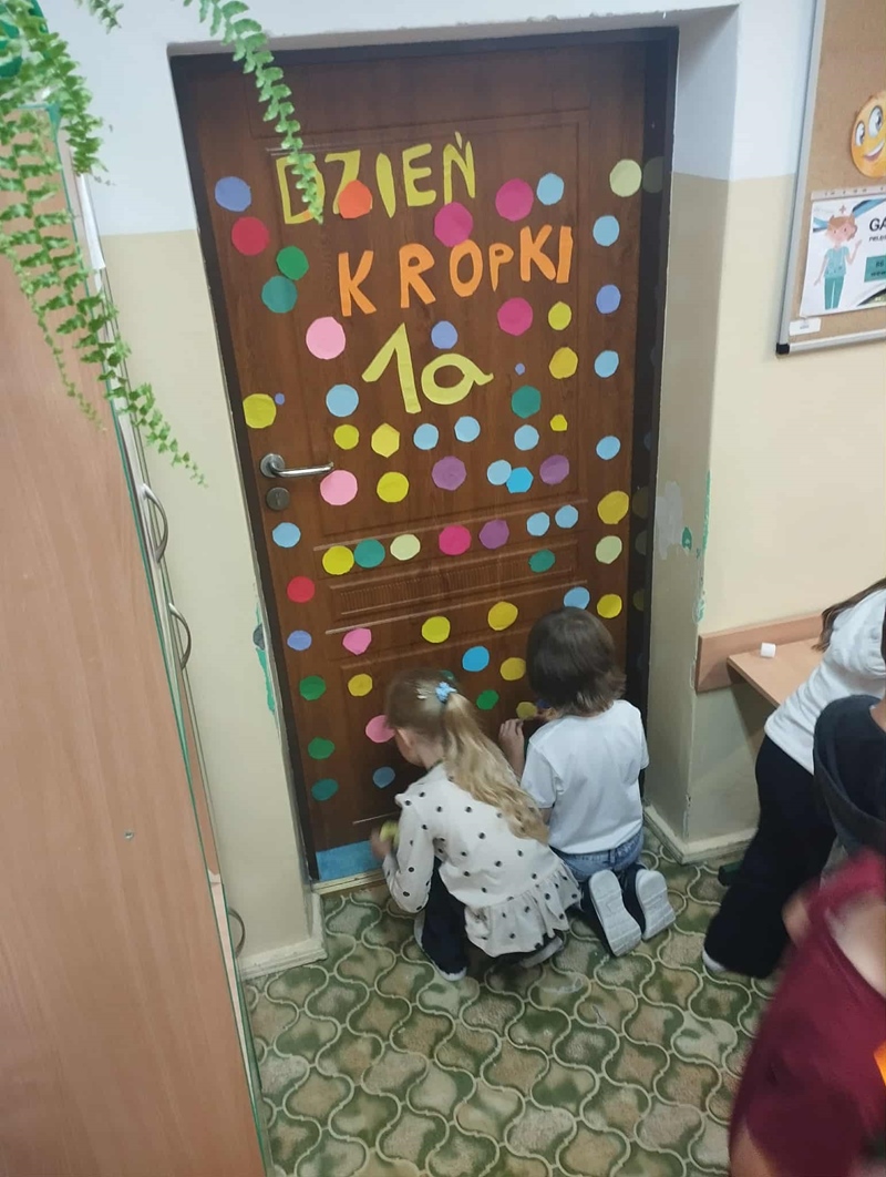 Ubrani w kropki ozdobiliśmy również kropkowymi kolażami drzwi swoich sal. Już wkrótce okaże się, która praca była najbardziej kreatywna, a do wykonawców trafią nagrody.