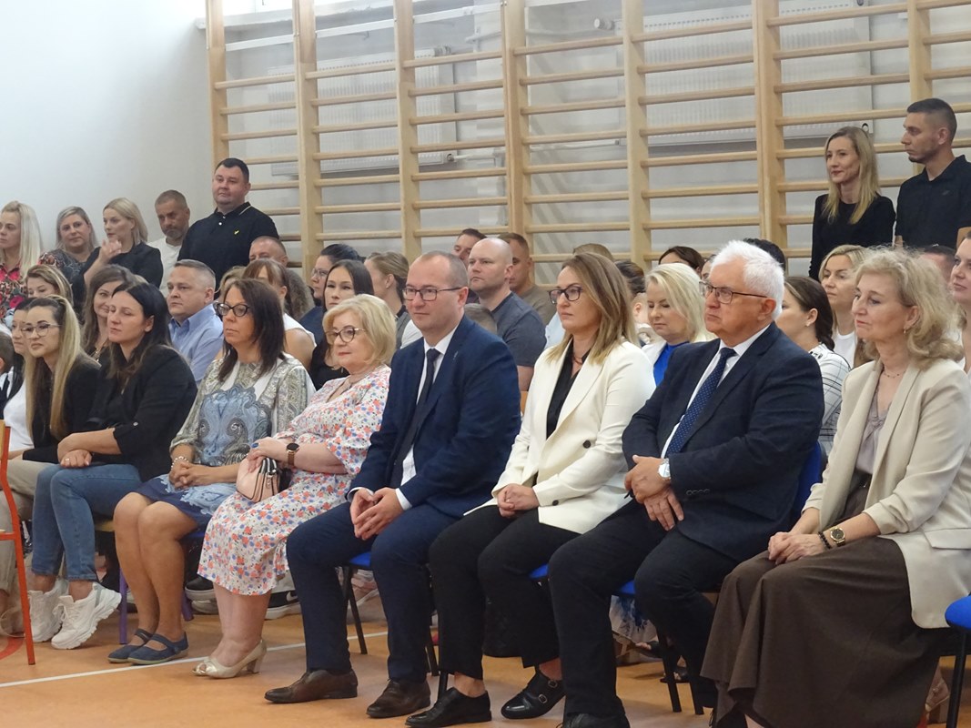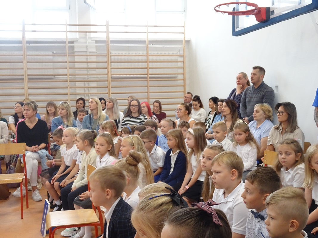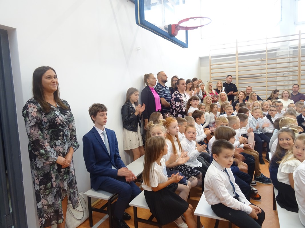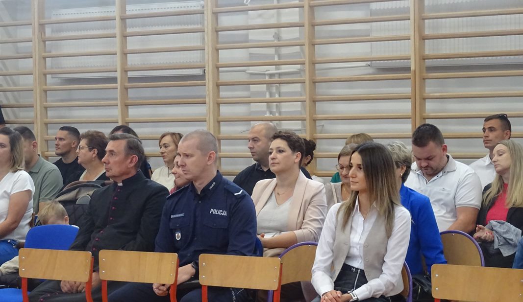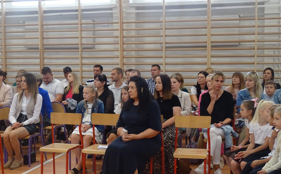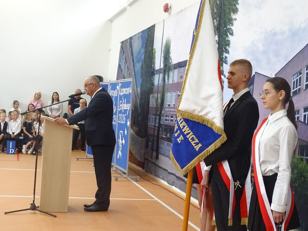 Po wprowadzeniu sztandaru szkoły i odśpiewaniu hymnu głos zabrał Dyrektor Pan Karol Choynowski. Powitał zgromadzonych w nowo wyremontowanej sali gimnastycznej, podkreślając znaczenie współpracy i wyrażając wdzięczność Burmistrzowi Panu Maciejowi Pawłowi Bednarko za osobiste zaangażowanie w rozwój szkoły, które stanowi fundament przyszłych sukcesów. Przedstawił wychowawczynie klas pierwszych – Panią Katarzynę Bobrowską, Panią Joannę Bernatek, Panią Karolinę Klimaszewską i Panią Katarzynę Górską. Szczególne słowa skierował do najmłodszych uczniów, życząc im odwagi, radości i wytrwałości na rozpoczynającej się edukacyjnej drodze.