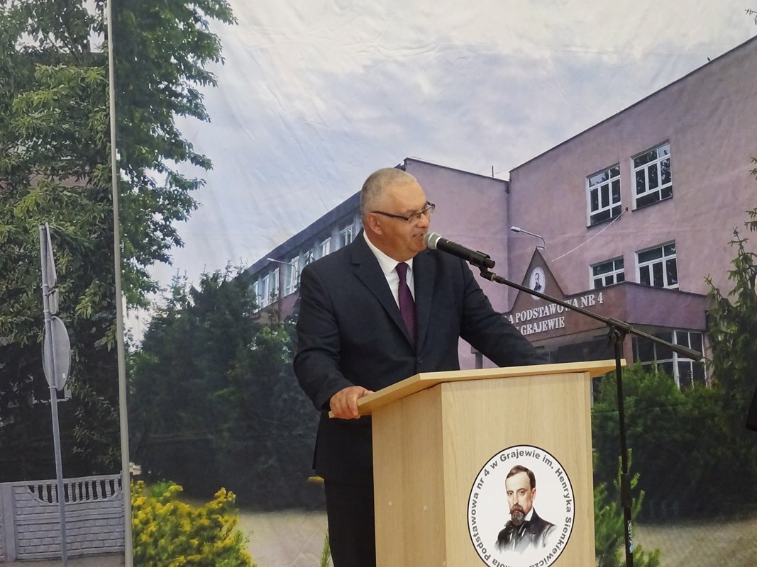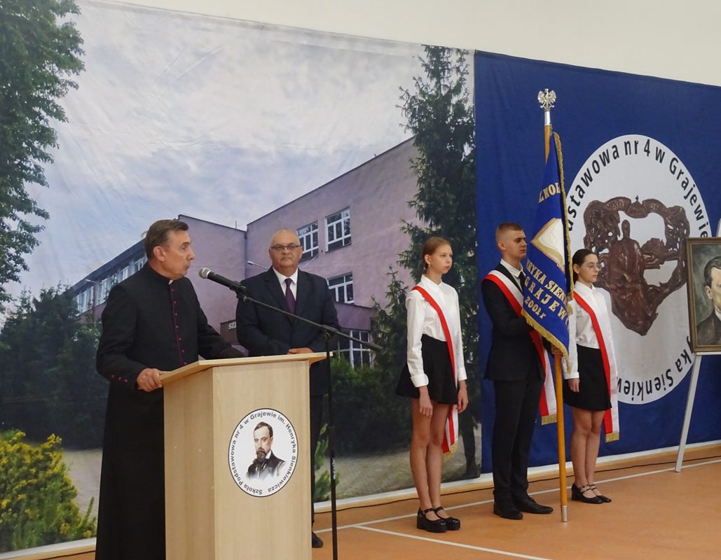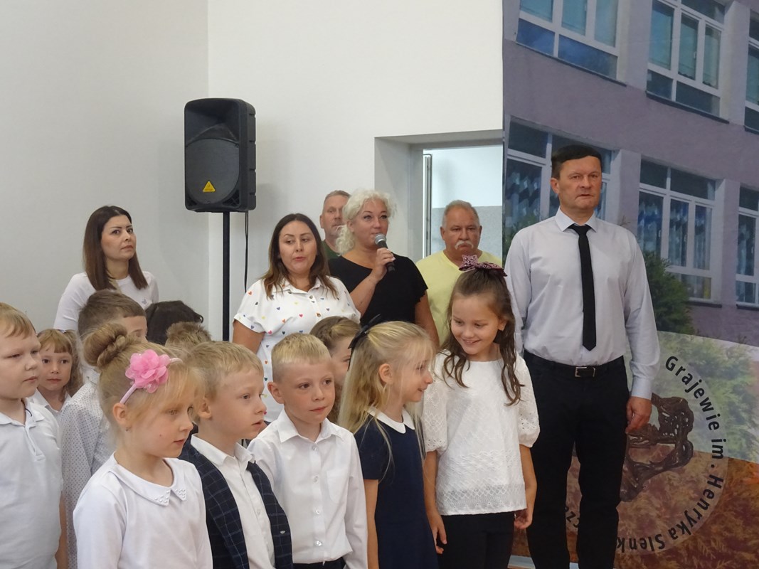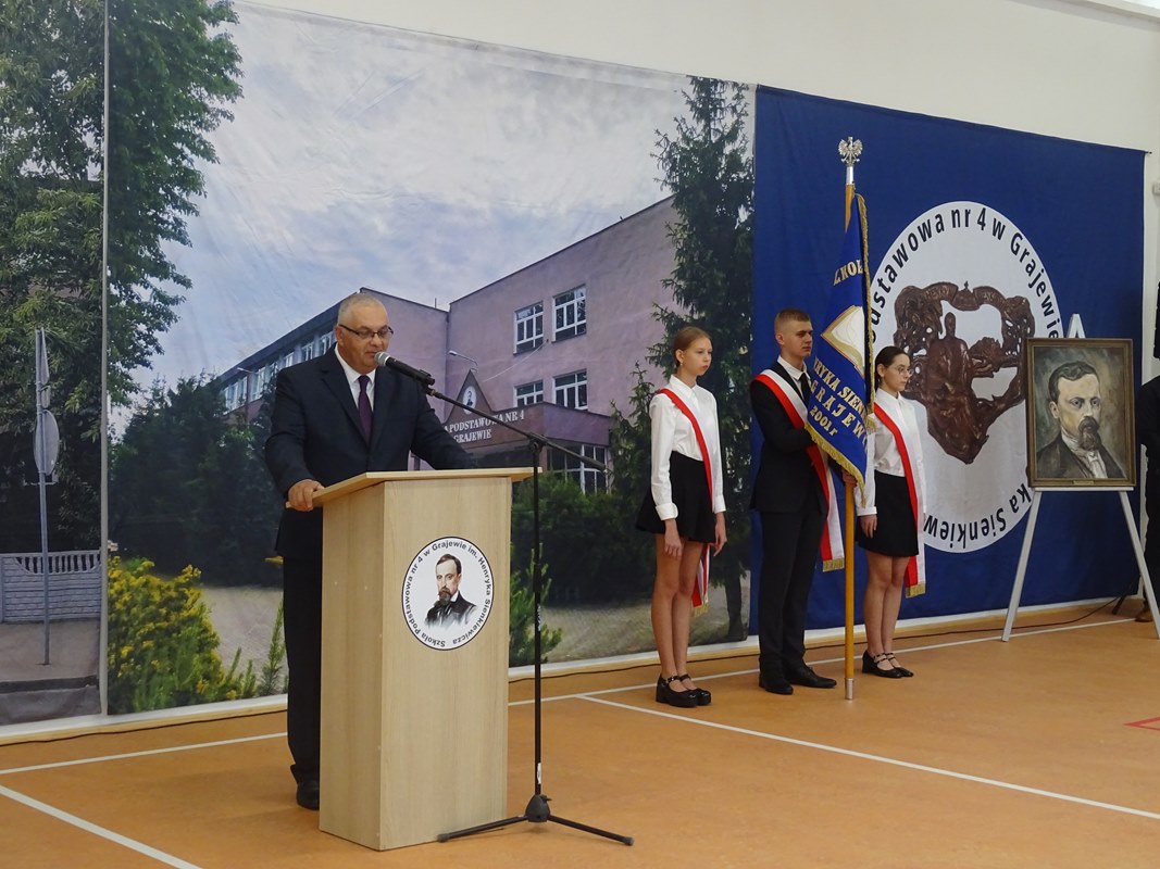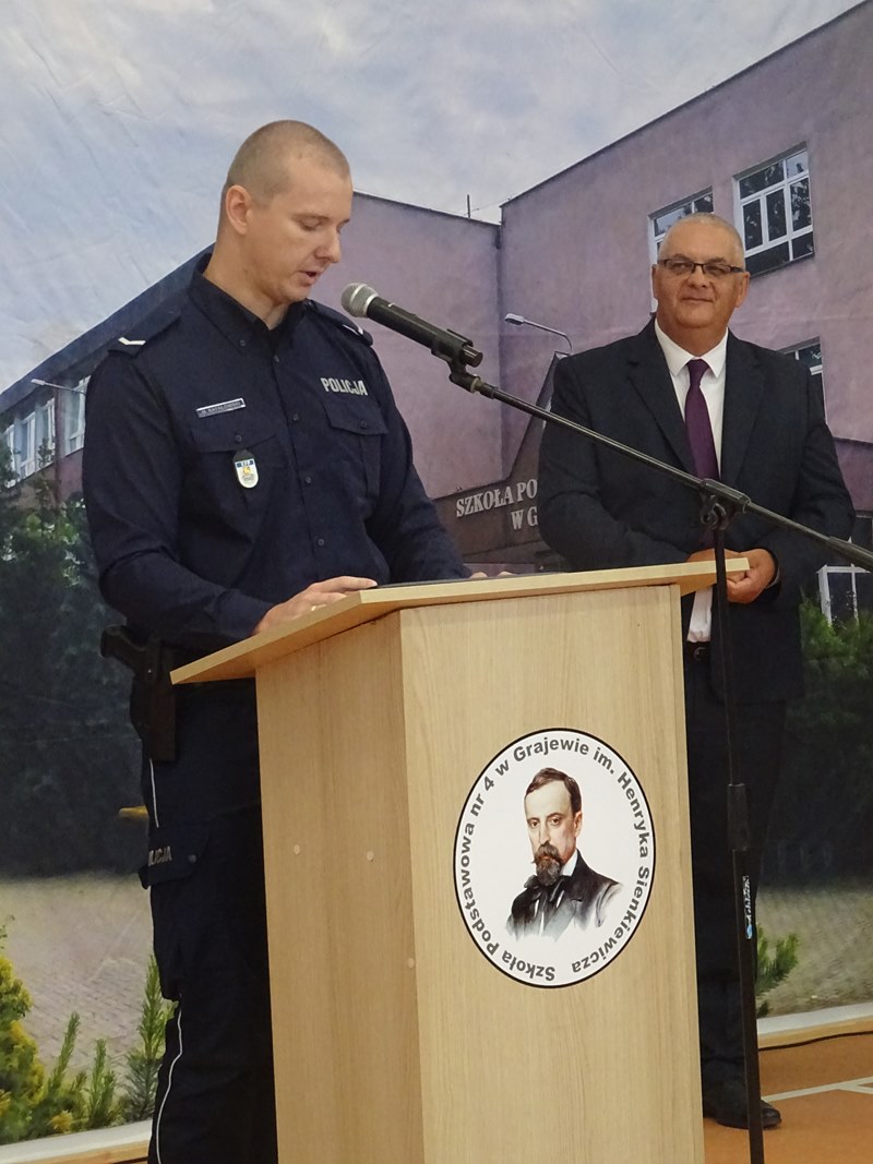Następnie głos zabrali zaproszeni goście. Burmistrz Miasta Grajewo, w imieniu swoim i Rady Miasta, podziękował za zaproszenie i życzył pierwszoklasistom siły, energii oraz wielu sukcesów w nauce. Ksiądz Dariusz Gosk podkreślił rolę edukacji w kształtowaniu przyszłych pokoleń, przypominając, że zadaniem dorosłych jest „dodawanie skrzydeł” i zaprosił wszystkich na Mszę Świętą w Parafii pw. Świętego Ojca Pio w najbliższą niedzielę o godzinie 10.00. Sierżant Maciej Rafałowski życzył uczniom bezpiecznego i przyjaznego roku szkolnego, przypominając o zasadach bezpieczeństwa w drodze do i ze szkoły, podczas zajęć oraz w czasie wolnym.