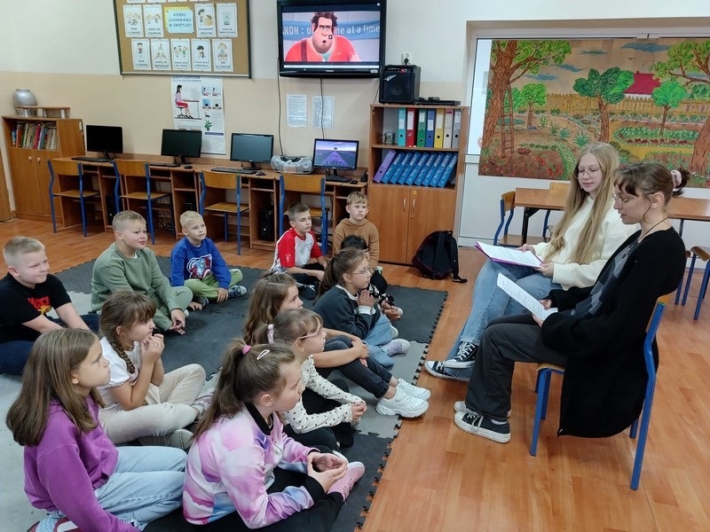 Z tej okazji uczennice z Koła Przyjaciół Biblioteki – Zuzanna Nowik, Zuzanna Pachucka, Patrycja Grabowska i Patrycja Makowska – przygotowały spotkania czytelnicze dla dzieci z oddziału przedszkolnego „Skrzaty” oraz świetlicy szkolnej. Rozpoczęły je ciepłym powitaniem i prezentacją kolorowych, wyjątkowych ksiąg, które wprowadziły najmłodszych w nastrój niezwykłej przygody. Mali słuchacze chętnie opowiadali o swoich ulubionych bajkach, wspomnieniach związanych z czytaniem oraz o tym, kto w domu towarzyszy im podczas lektury.