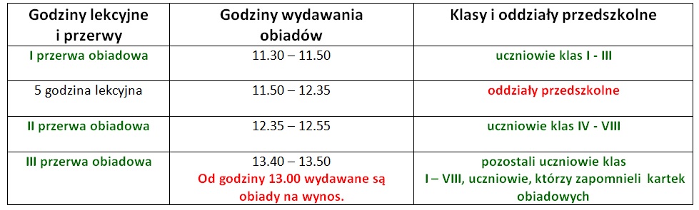 Świetlica czynna jest od poniedziałku do piątku od 7.00 do 16.30. Stołówka szkolna wydaje obiady od 3 września 2025 r.