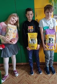 Szkolny Klub Wolontariusza zebrał dla psów: 57 kg karmy suchej, mokrej 25 kg oraz smaczki i karmę dla kotów: 5 kg karmy mokrej i 2 kg suchej.