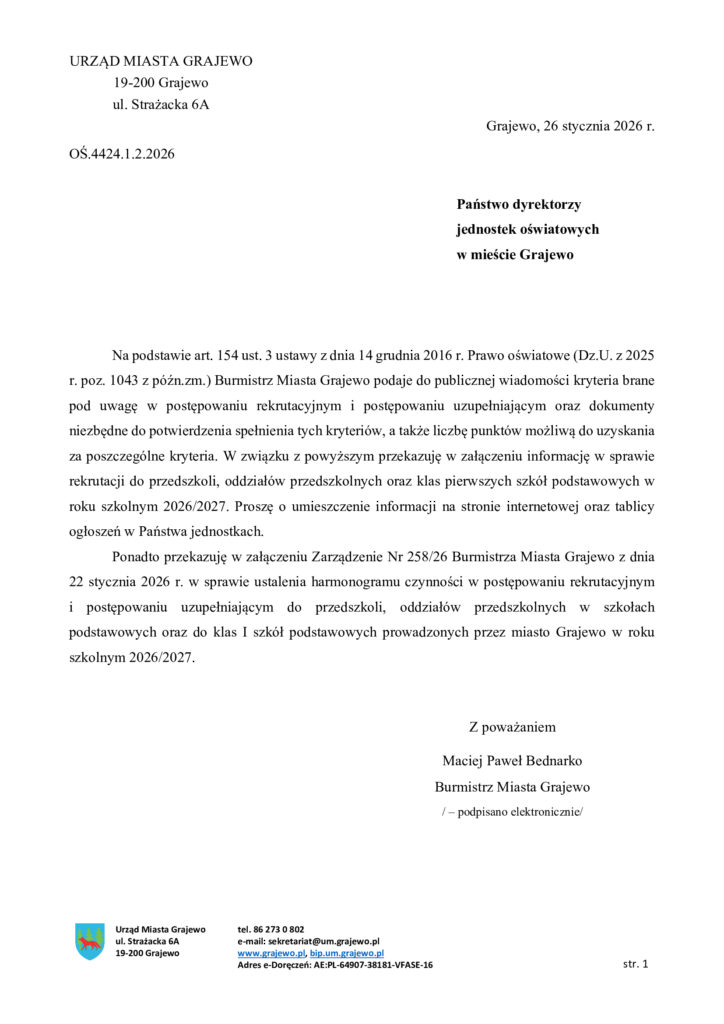 Dyrektor Szkoły Podstawowej nr 4 w Grajewie informuje, że zgodnie z Ustawą z dnia 14 grudnia 2016r. Prawo oświatowe dzieci urodzone w 2020 roku są objęte rocznym przygotowaniem przedszkolnym.