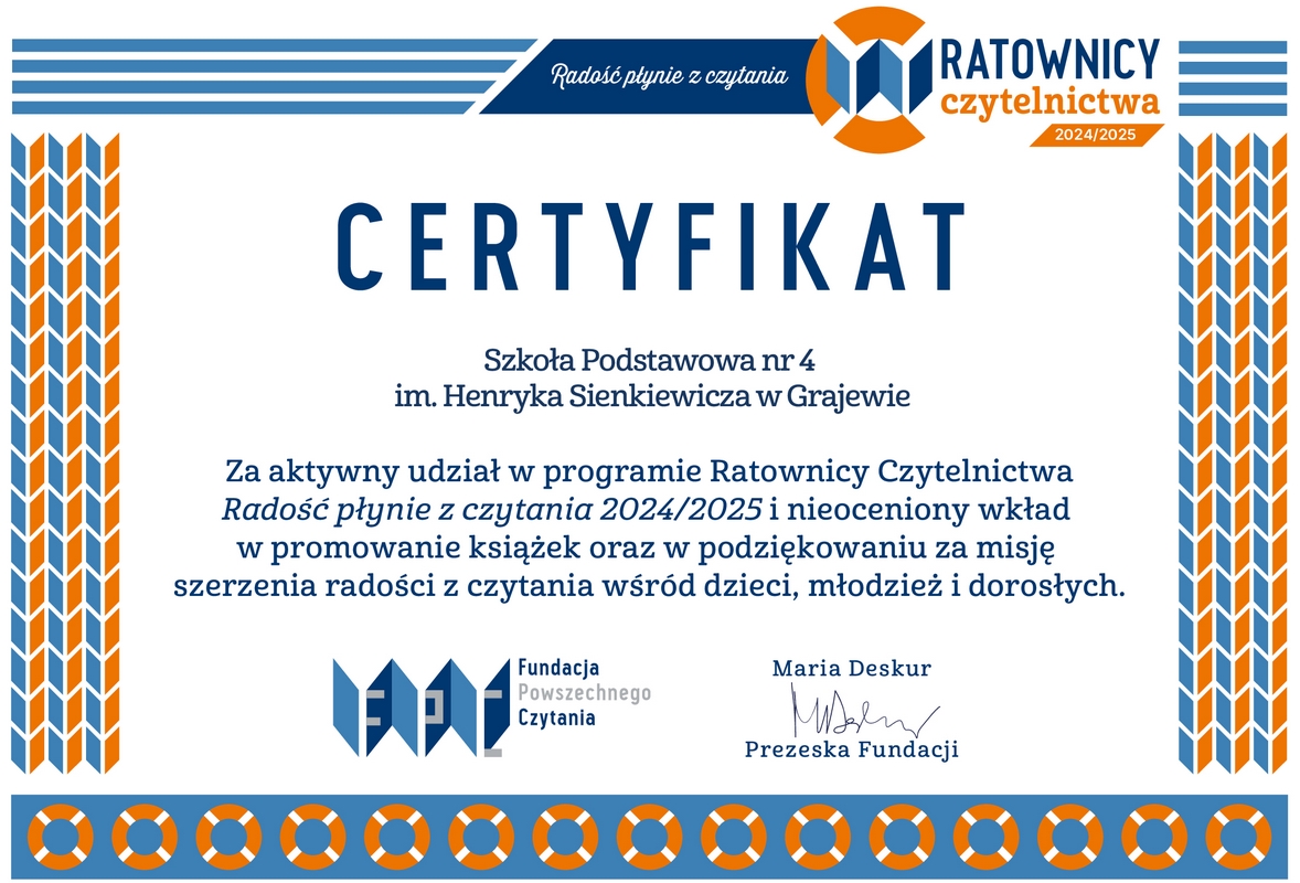Serdecznie dziękuję Społeczności Szkoły Podstawowej nr 4 im. Henryka Sienkiewicza w Grajewie i instytucjom za aktywny udział w działaniach realizowanych w roku szkolnym 2024/2025 w ramach OGÓLNOPOLSKIEGO PROGRAMU „RATOWNICY CZYTELNICTWA” pod hasłem „RADOŚĆ PŁYNIE Z CZYTANIA”, organizowanego przez Fundację Powszechnego Czytania i jej partnerów.
