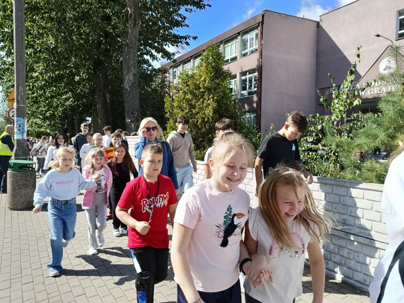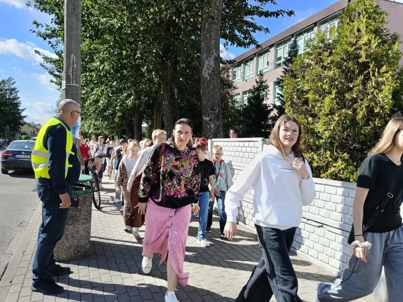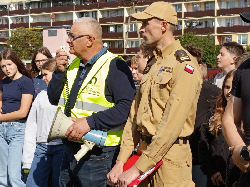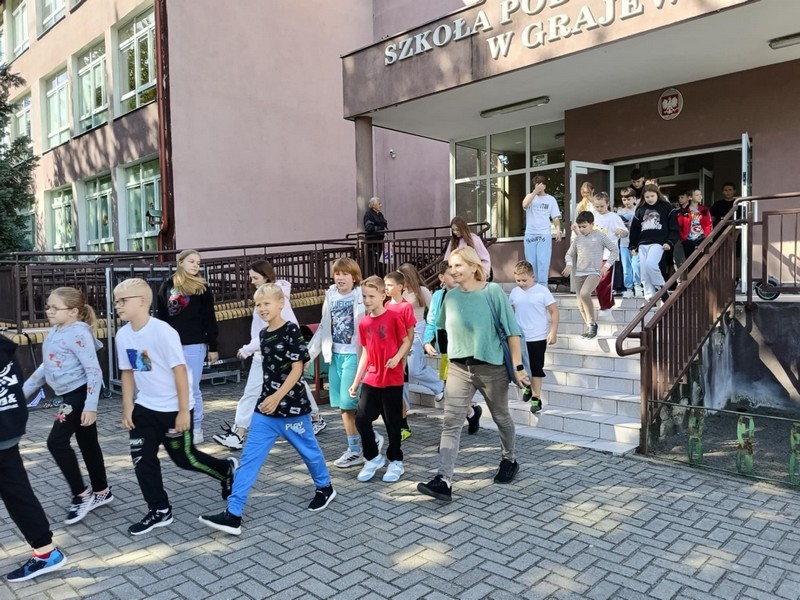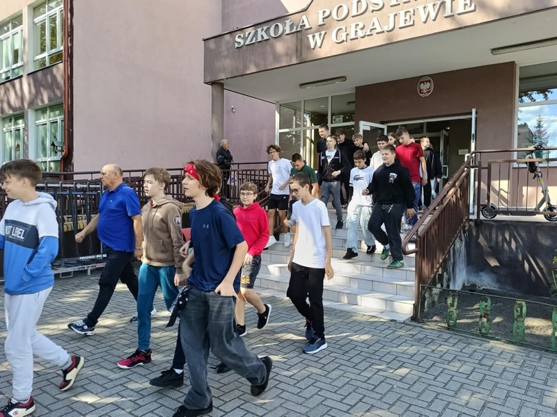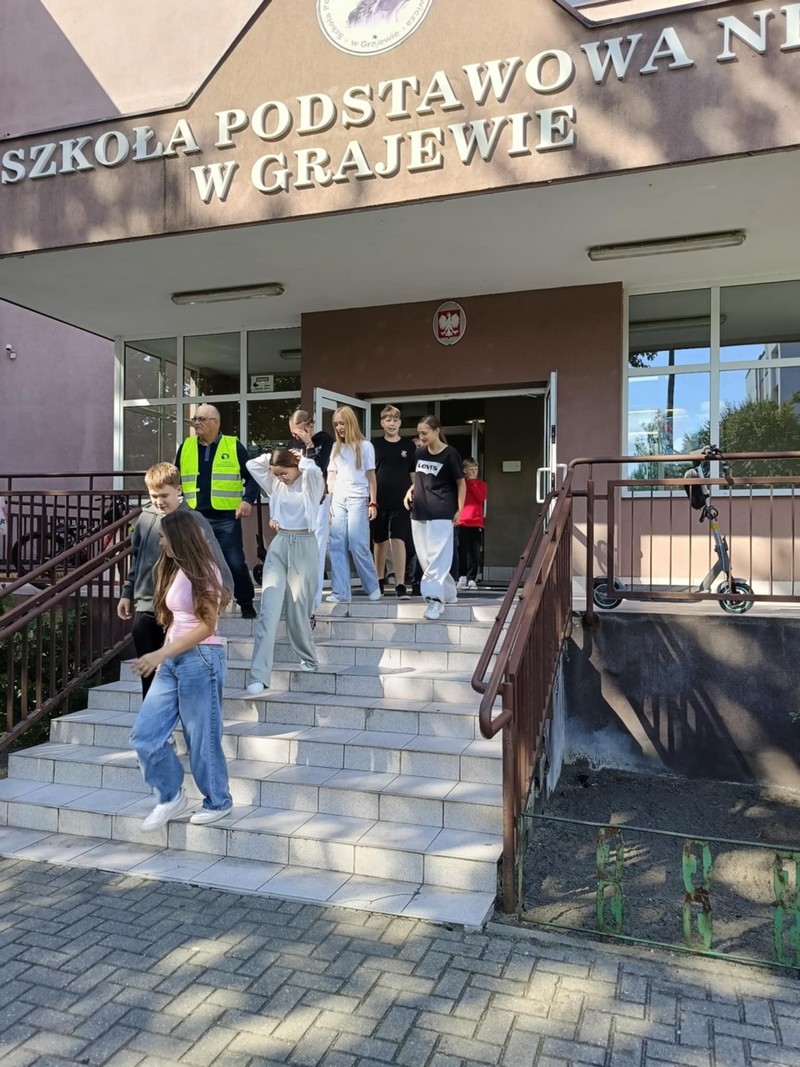 O godzinie 13:00 w budynkach szkoły uruchomiono sygnał alarmowy. Uczniowie wraz z nauczycielami opuścili sale lekcyjne i wyznaczonymi drogami ewakuacyjnymi udali się na boisko szkolne – miejsce zbiórki. Cała akcja przebiegła sprawnie i zgodnie z procedurami – podkreślił koordynator ewakuacji, Dyrektor szkoły, p. Karol Choynowski. Następnie głos zabrał Zastępca Komendanta Powiatowego Państwowej Straży Pożarnej w Grajewie, bryg. Daniel Lewczuk. Zwrócił uwagę, że w sytuacjach zagrożenia kluczowe znaczenie mają spokój, stosowanie się do poleceń nauczycieli i służb mundurowych oraz śledzenie alertów bezpieczeństwa.