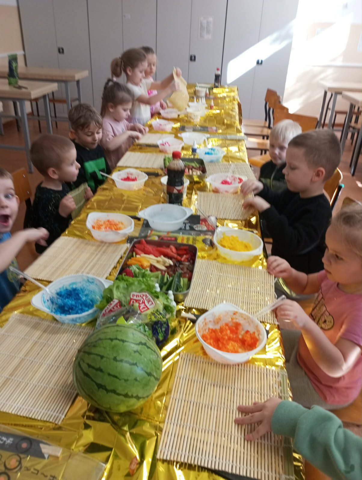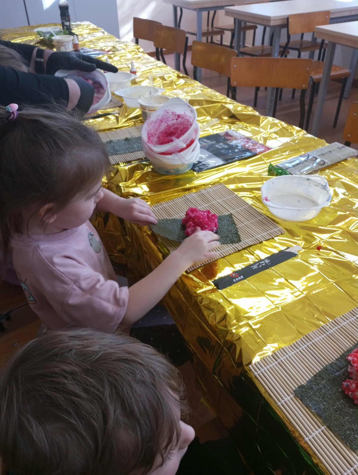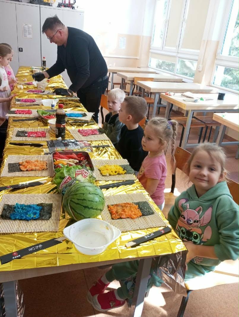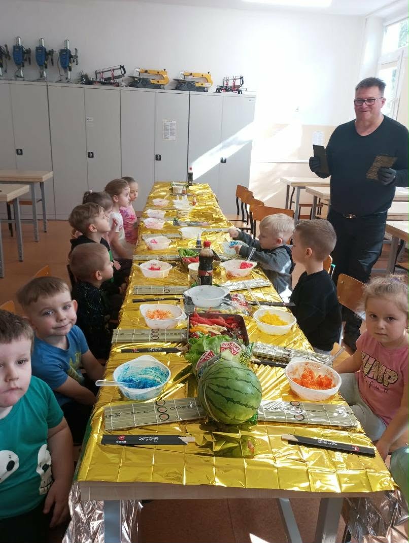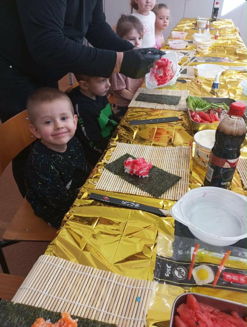W przedszkolu odbyły się warsztaty sushi dla dzieci z grupy „Słoneczka”. Na początku dzieci dowiedziały się, z czego robi się sushi. Poznały ryż, warzywa i inne składniki. Prowadzący pokazał, jak wygląda przygotowanie sushi. Następnie dzieci same próbowały zrobić swoje rolki. Układały składniki i zwijały je w maty. Sprawiło im to dużo radości. Na końcu wszyscy spróbowali przygotowanego sushi.