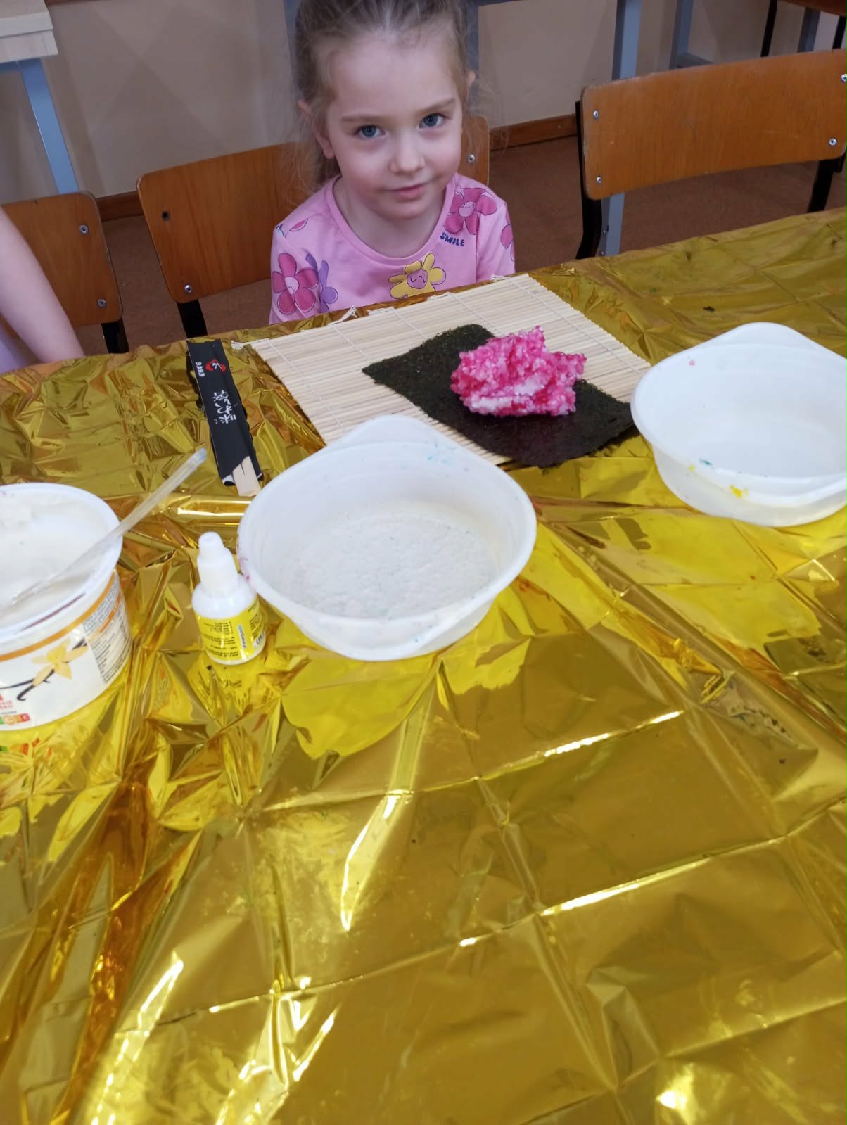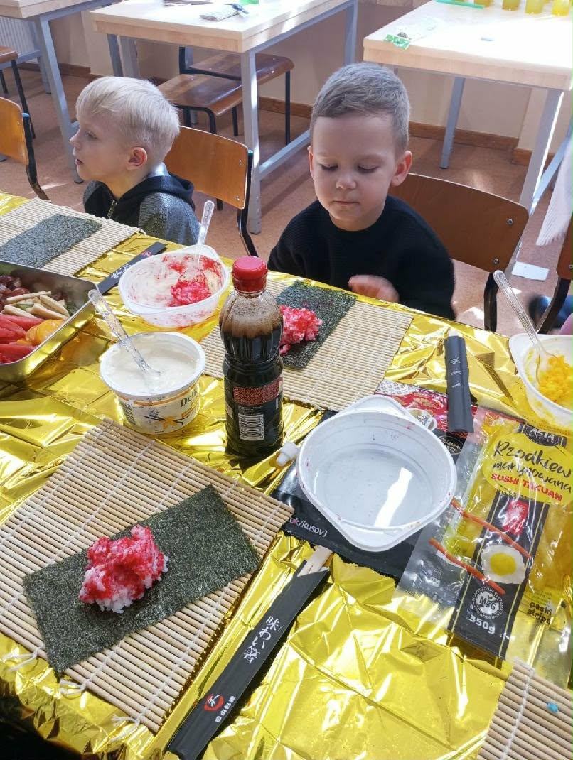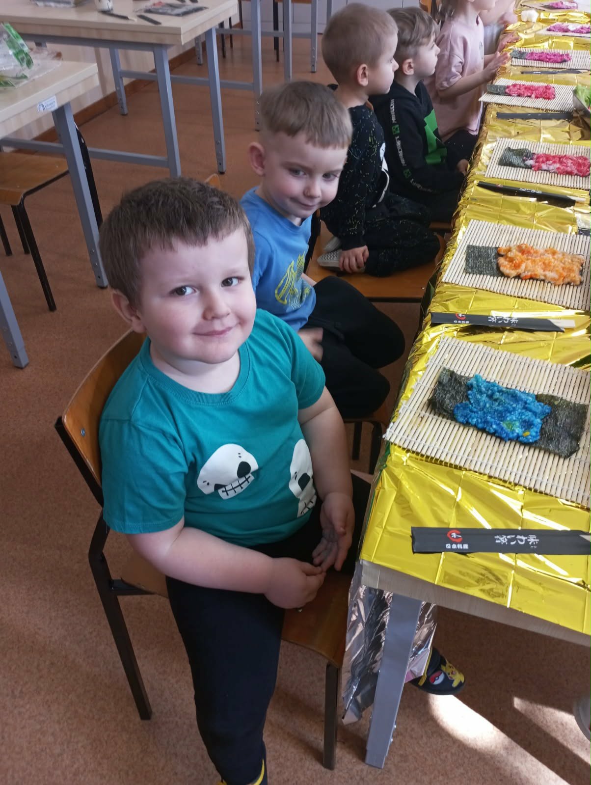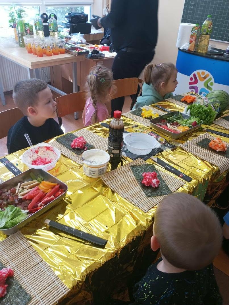 W przedszkolu odbyły się warsztaty sushi dla dzieci z grupy „Słoneczka”. Na początku dzieci dowiedziały się, z czego robi się sushi. Poznały ryż, warzywa i inne składniki. Prowadzący pokazał, jak wygląda przygotowanie sushi. Następnie dzieci same próbowały zrobić swoje rolki. Układały składniki i zwijały je w maty. Sprawiło im to dużo radości. Na końcu wszyscy spróbowali przygotowanego sushi.