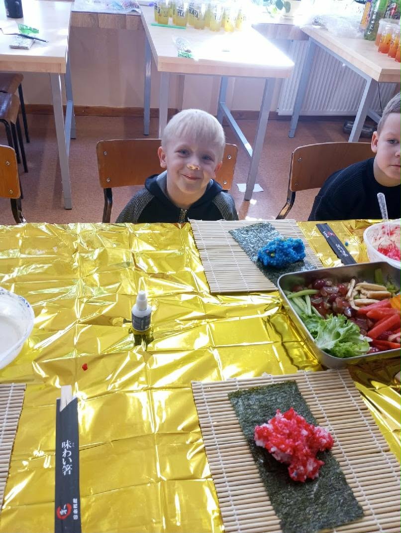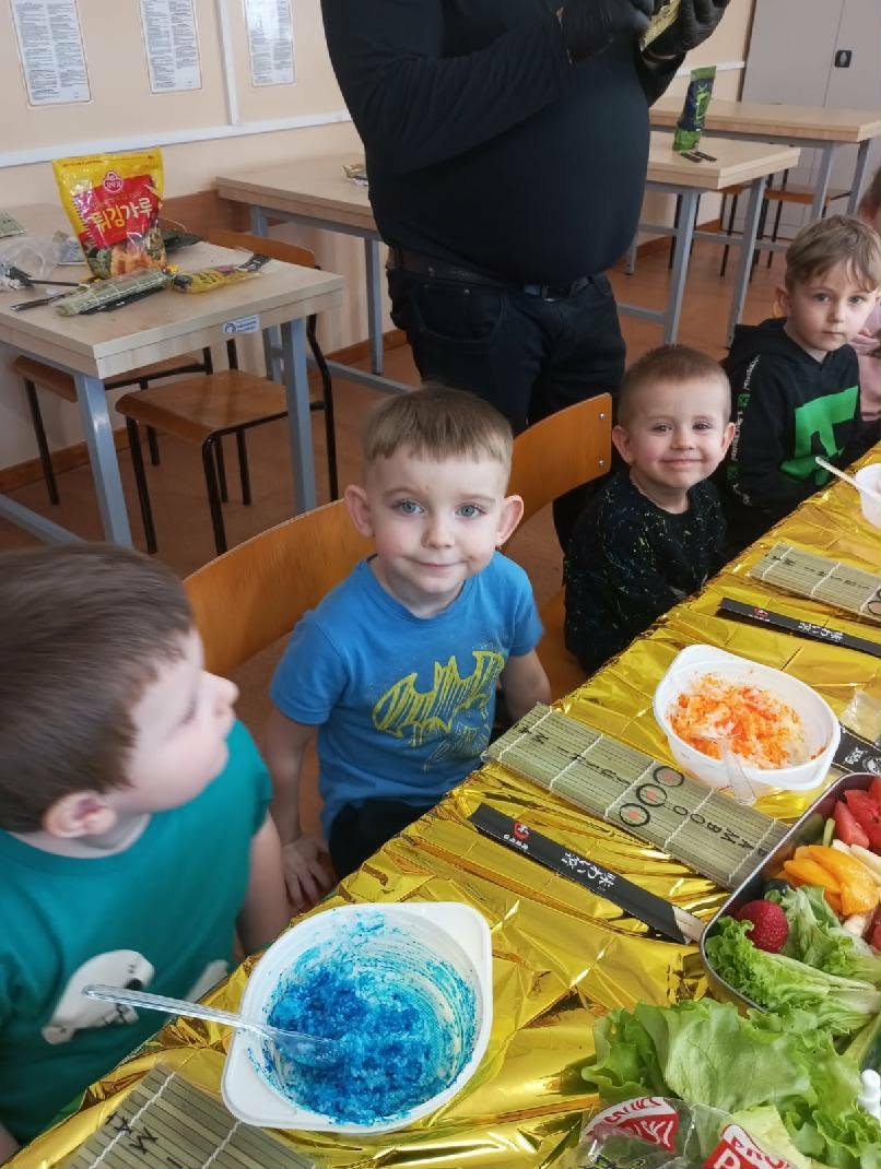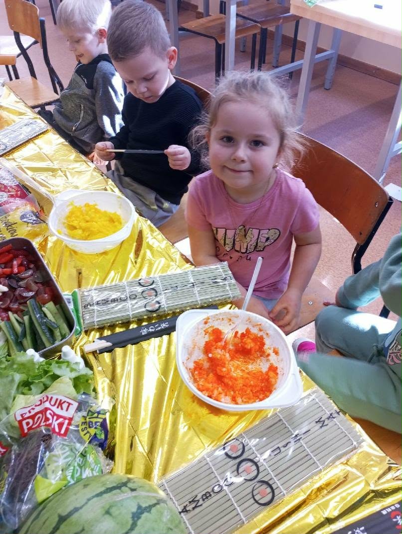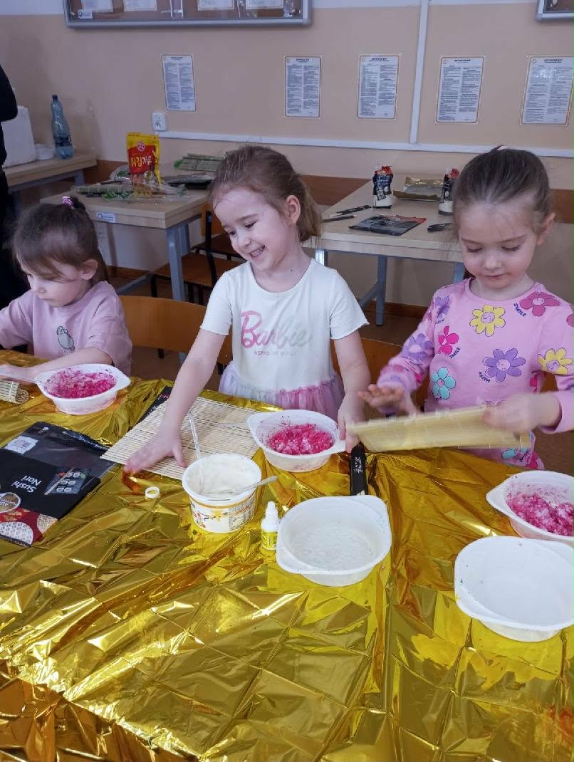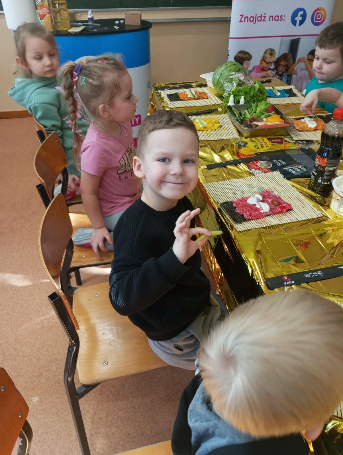 W przedszkolu odbyły się warsztaty sushi dla dzieci z grupy „Słoneczka”. Na początku dzieci dowiedziały się, z czego robi się sushi. Poznały ryż, warzywa i inne składniki. Prowadzący pokazał, jak wygląda przygotowanie sushi. Następnie dzieci same próbowały zrobić swoje rolki. Układały składniki i zwijały je w maty. Sprawiło im to dużo radości. Na końcu wszyscy spróbowali przygotowanego sushi.