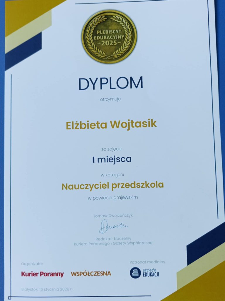 Z radością informujemy, że 16 stycznia 2026 roku, nominowana w plebiscycie przez rodziców PANI ELŻBIETA WOJTASIK, nauczycielka naszej szkoły, zajęła I miejsce w kategorii „Nauczyciel Przedszkola” w powiecie grajewskim.